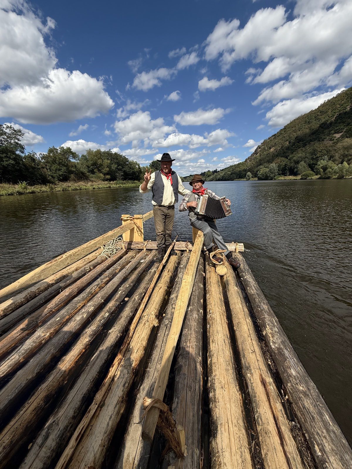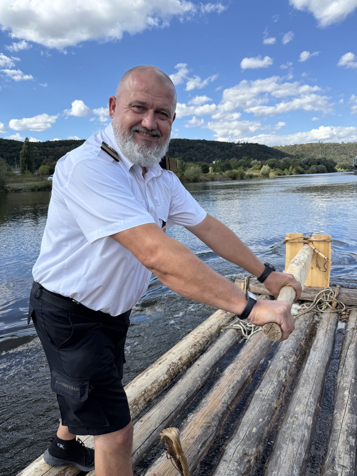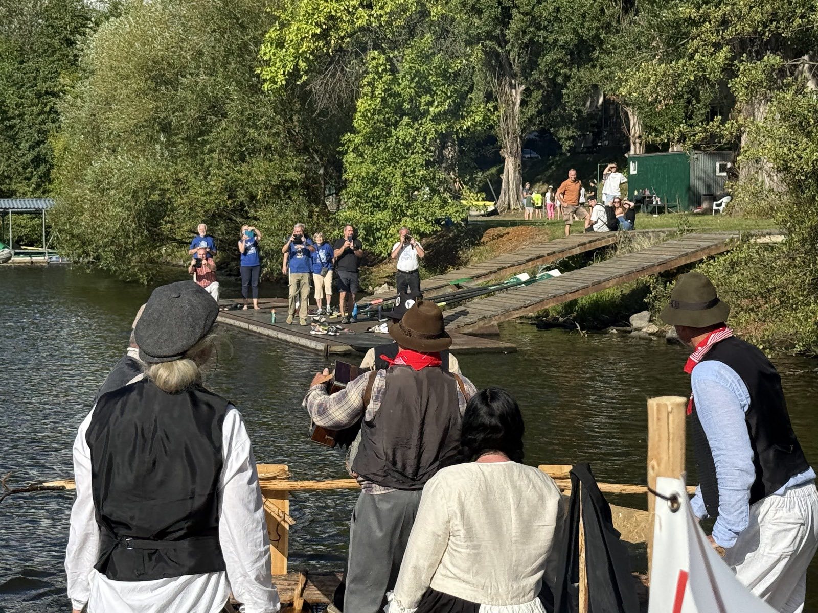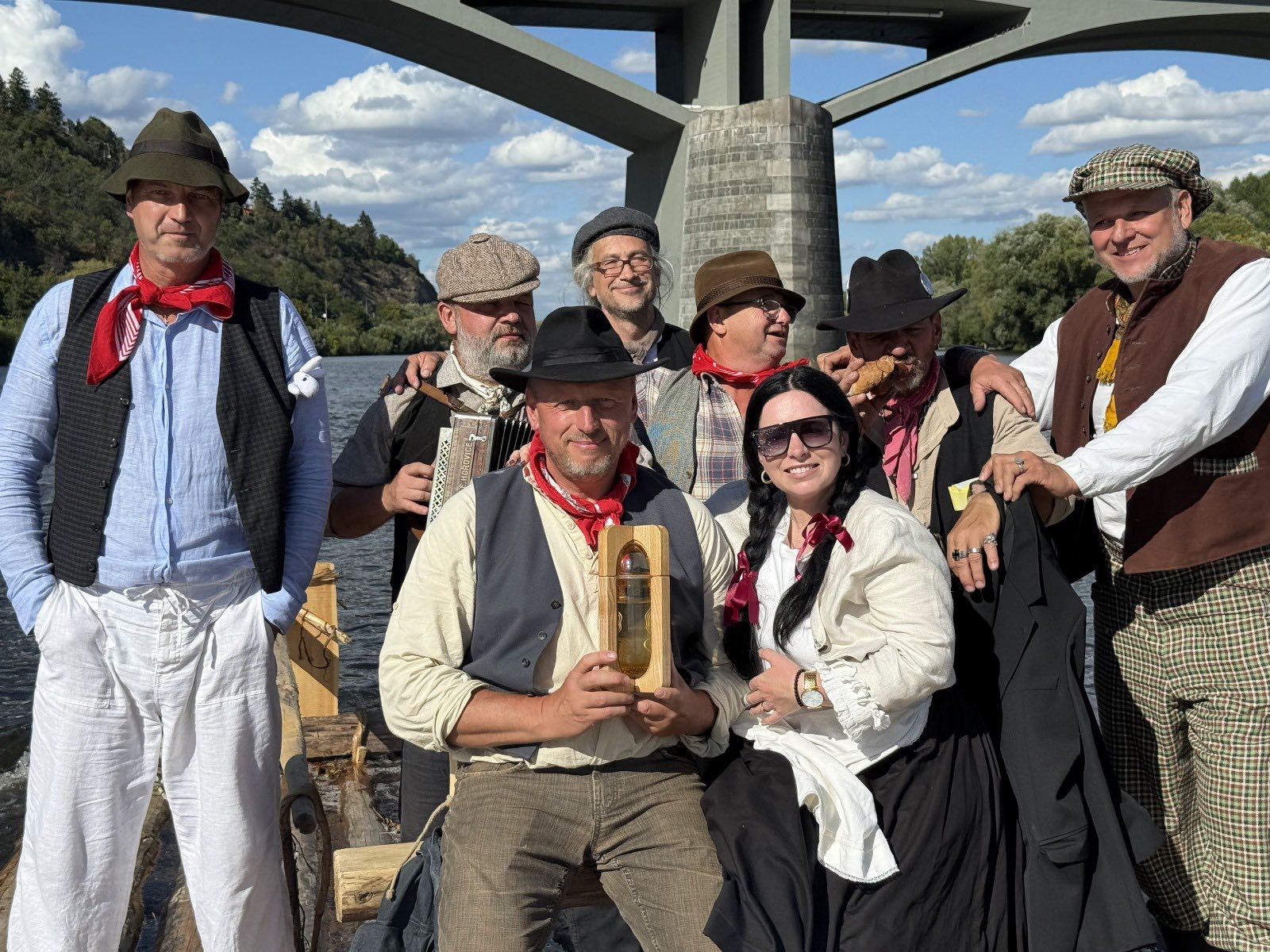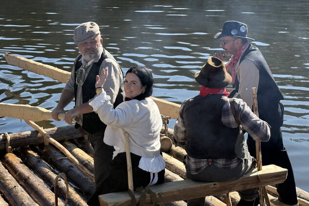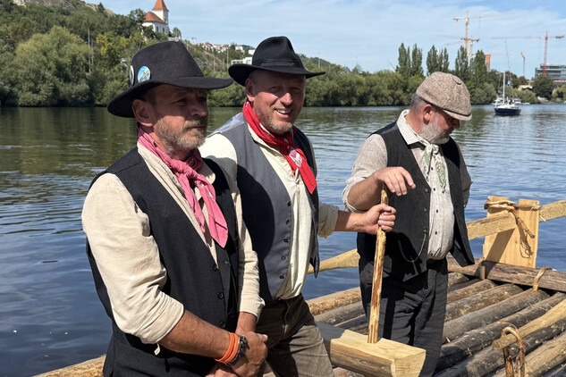Trojice plavců z Purkarce, ve složení vrátný Jan Pöschl, Josef Nachlinger a Jan Pöschl na historické vorové tabuli ve čtvrtek 4. září dopravili z pražského veslařského klubu Bohemians TJ na Rašínovo nábřeží k bočnokolesovému parníku Vltava manželku prezidenta ČR Evu Pavlovou.