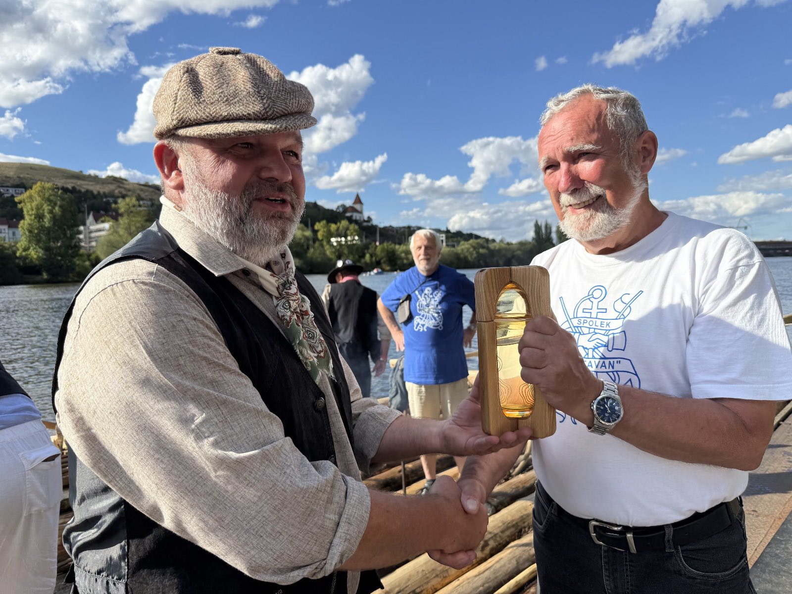 Na „Bohemce“ předal vrátný voru Jan Pöschl vodu z pramenů Vltavy předsedovi Vltavanu Praha Václavu Hodrovi, který ji druhý den v poledne svěřil do rukou Evy Pavlové.