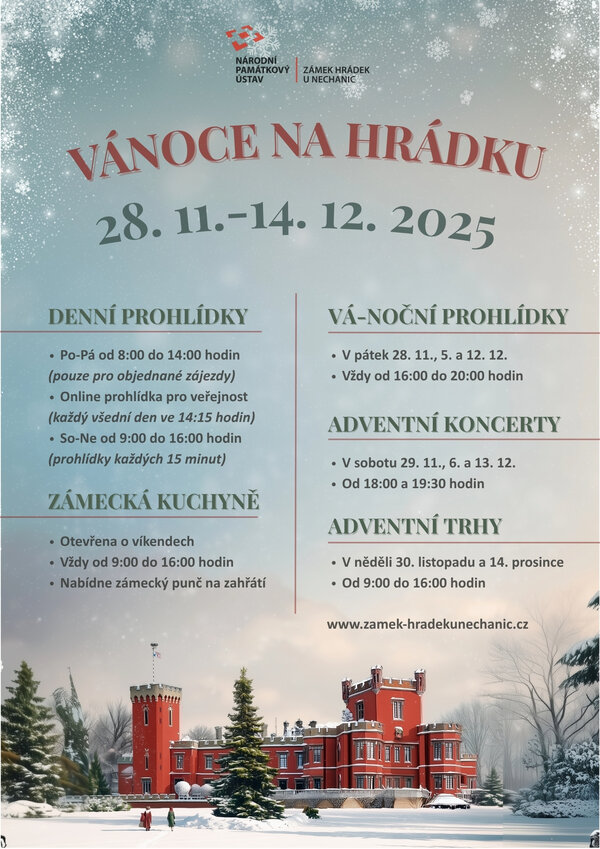 O víkendech 29.-30. 11., 6.-7. 12. a 13.-14. 12. 2025 je zámek otevřen denně od 9.00 do 16.00 hodin pro veřejnost bez nutnosti rezervace. Rezervace je nutná v případě zájezdů.
